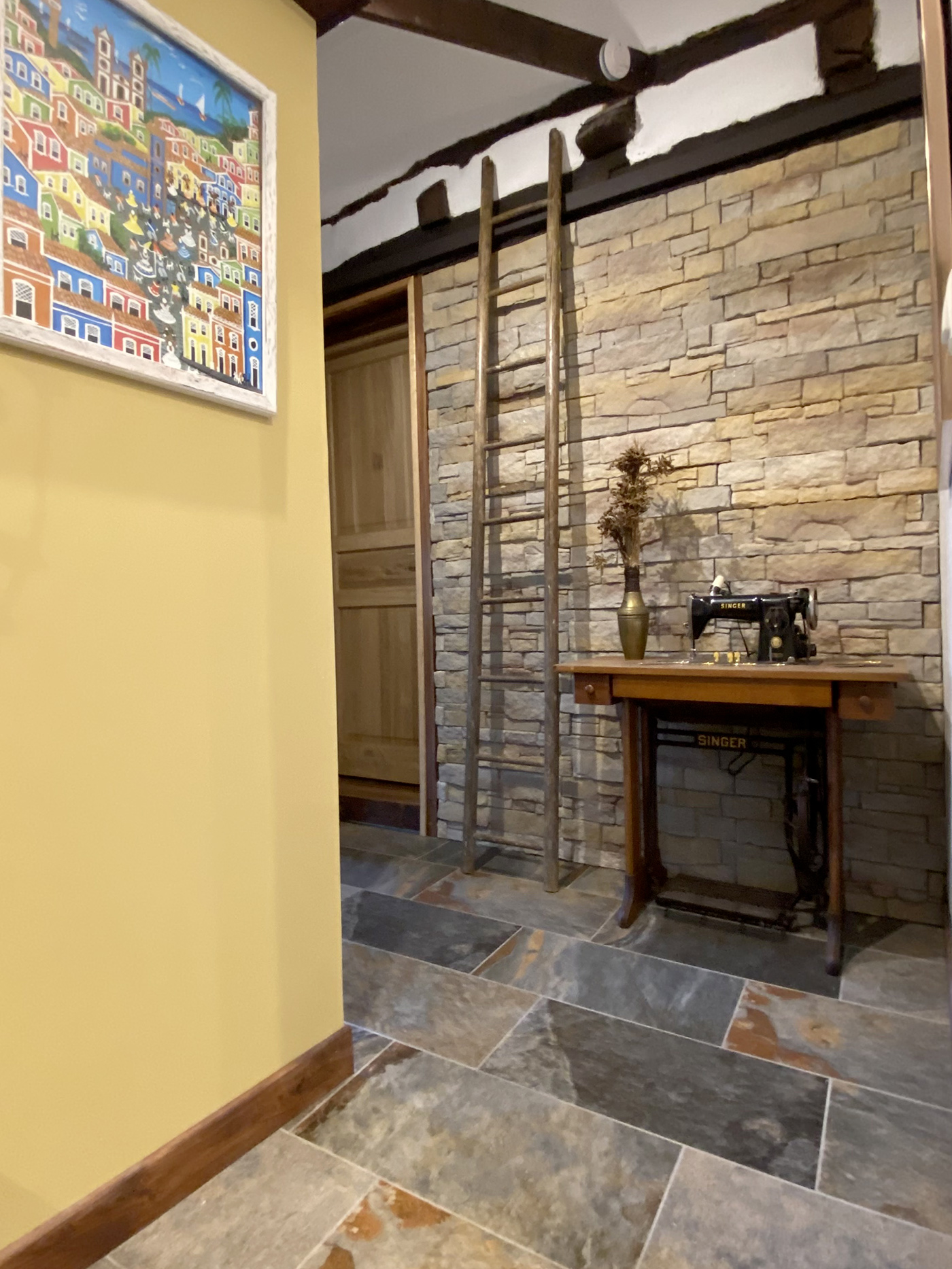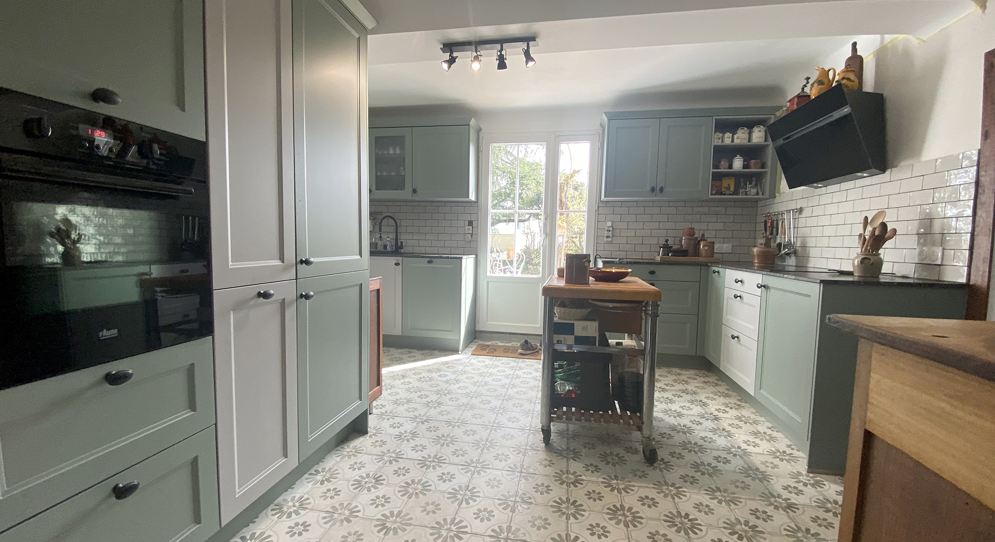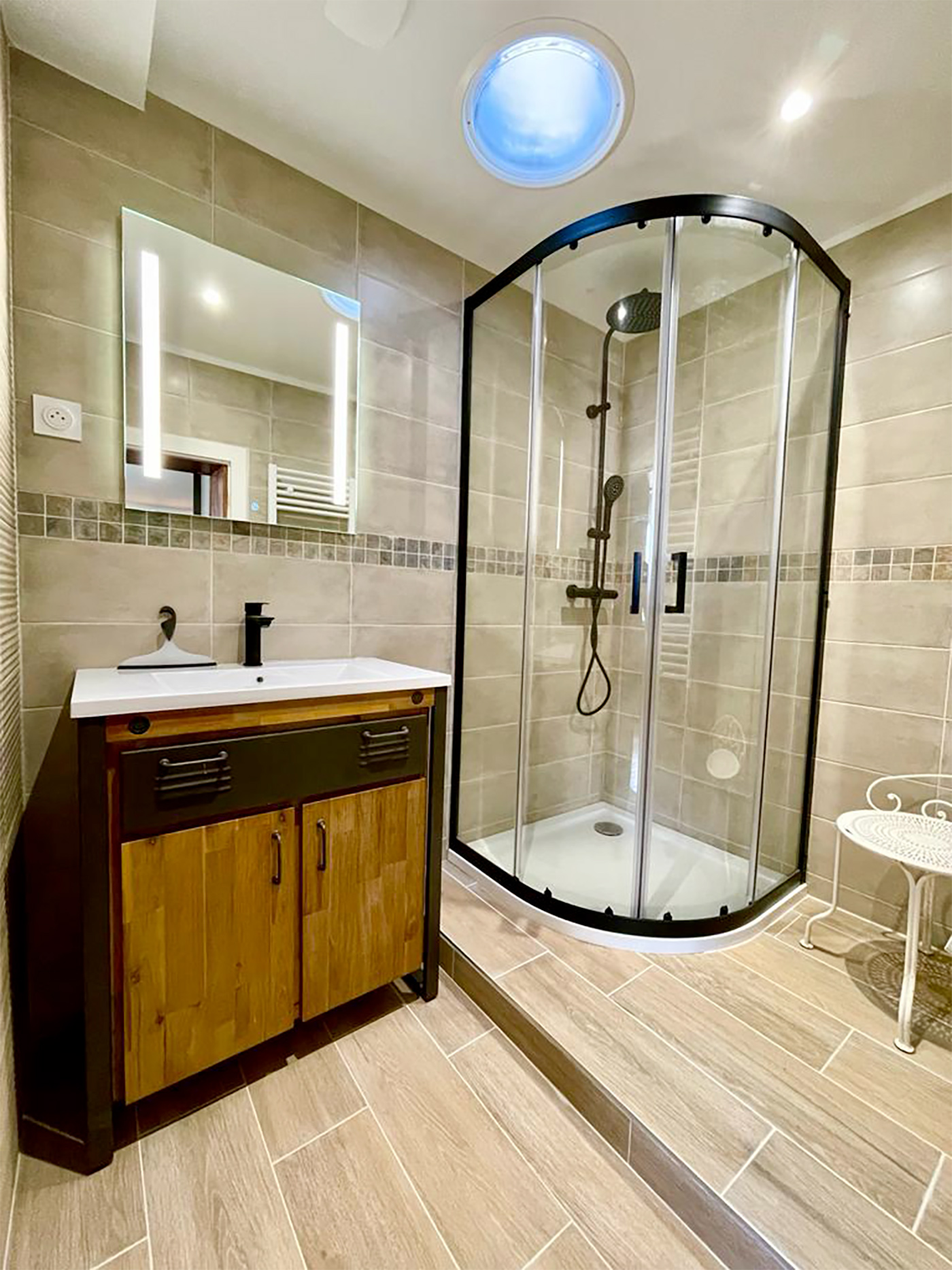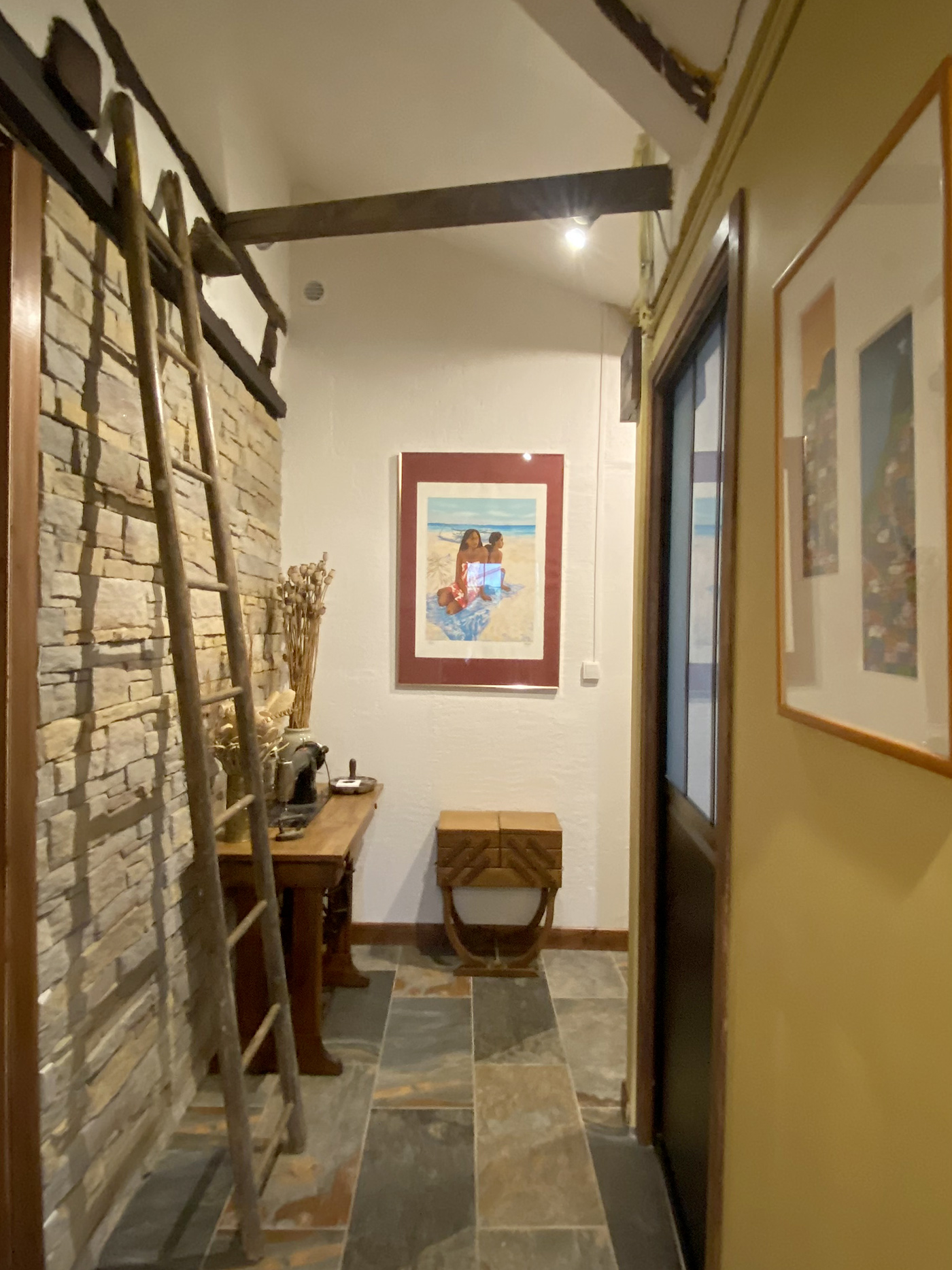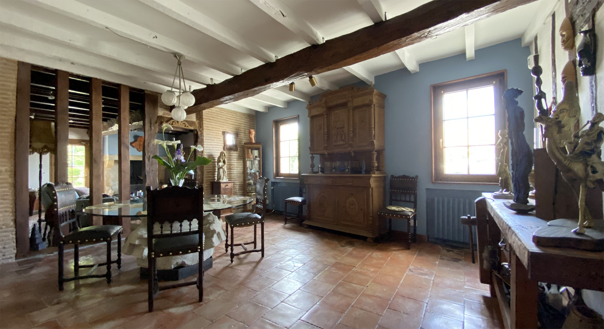 Rénovation totale en Dordogne. La strucutre de la maison demandée un réamenagement des pièces de vie et de circulation. Création d'une 3ème salle de bain et d'un espace suplémentaire dans la cuisine pour y manger. Création d'ouverture et fermeture pour faciliter la circulation. Mise en place de puits de lumière dans les 2 salles de bain rénovées. Sélection du mobilier (souvent chiné en brocante), des materiaux et des couleurs.