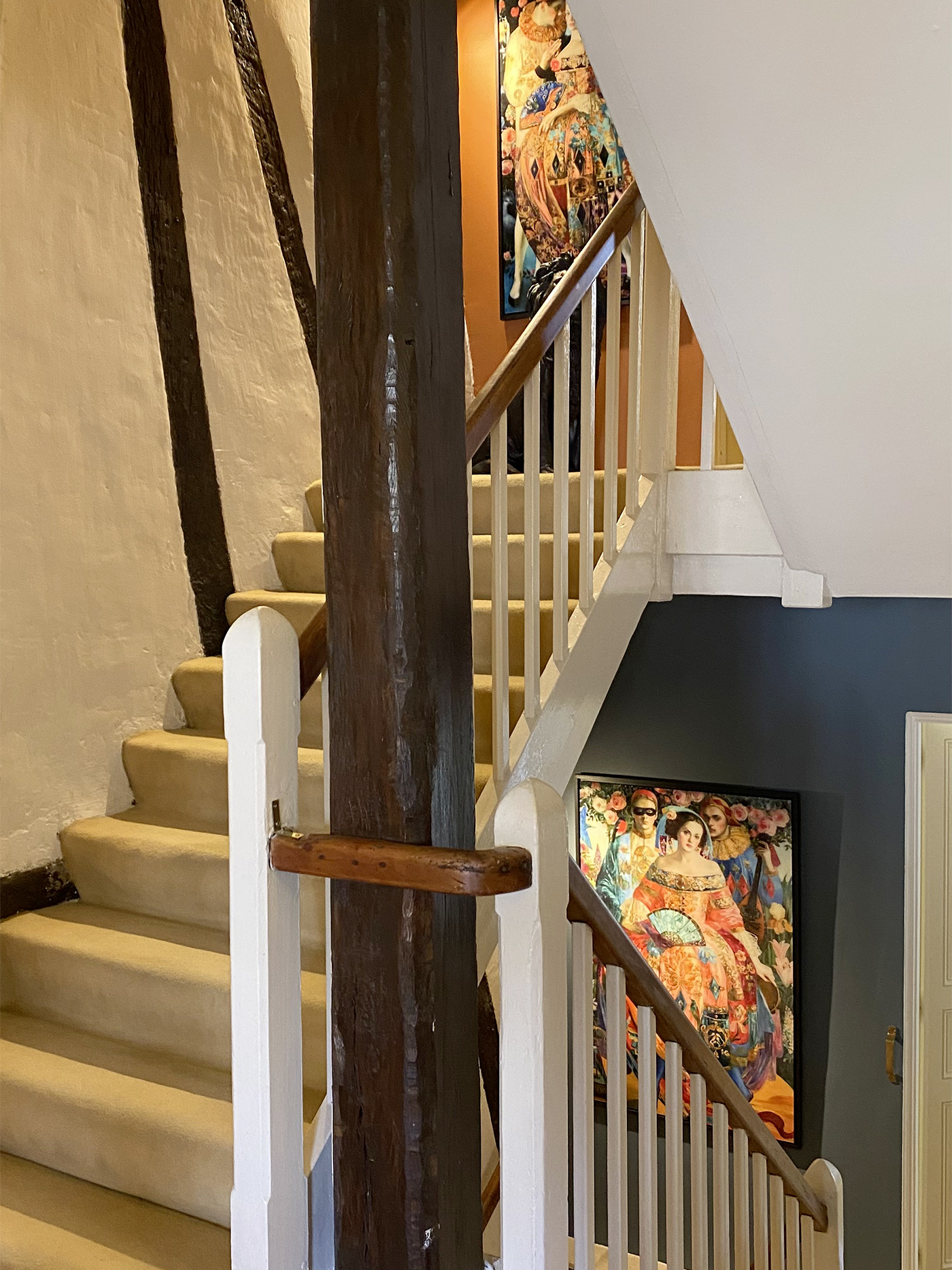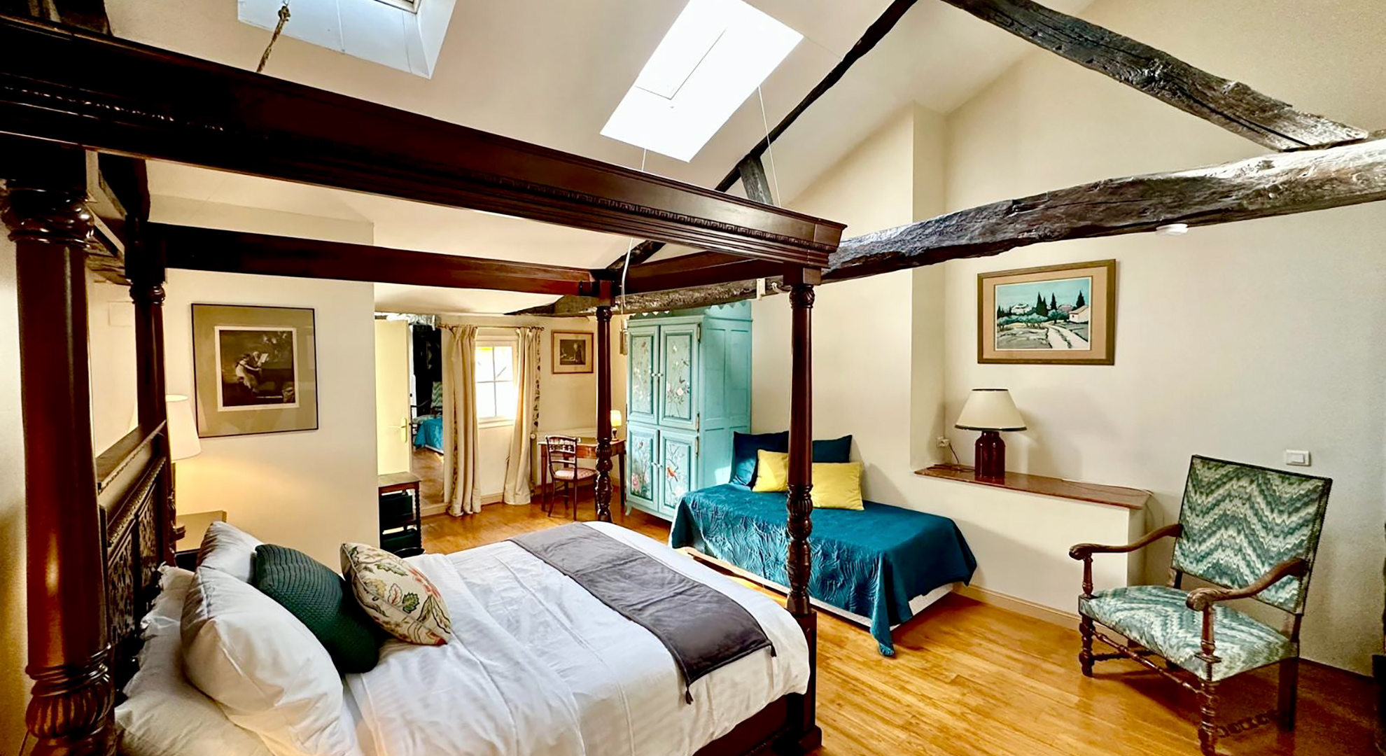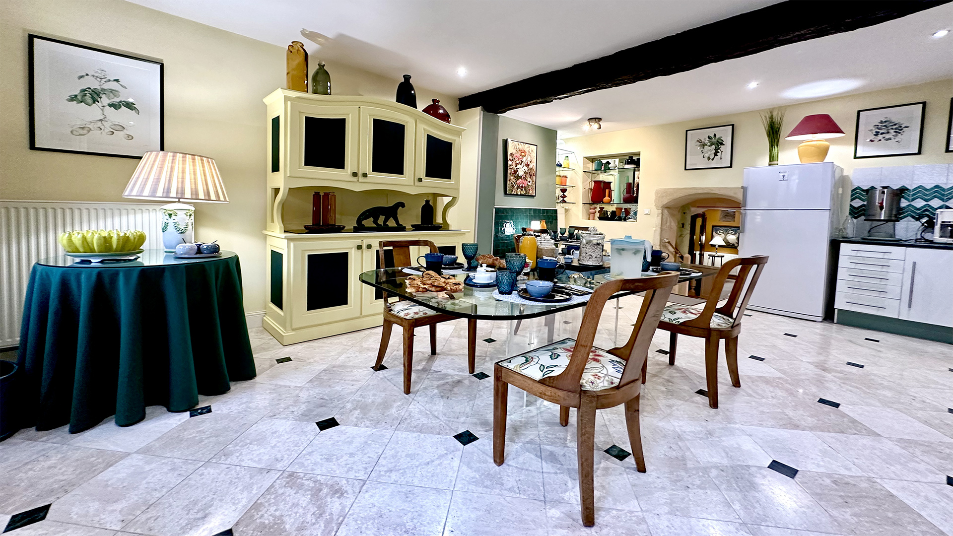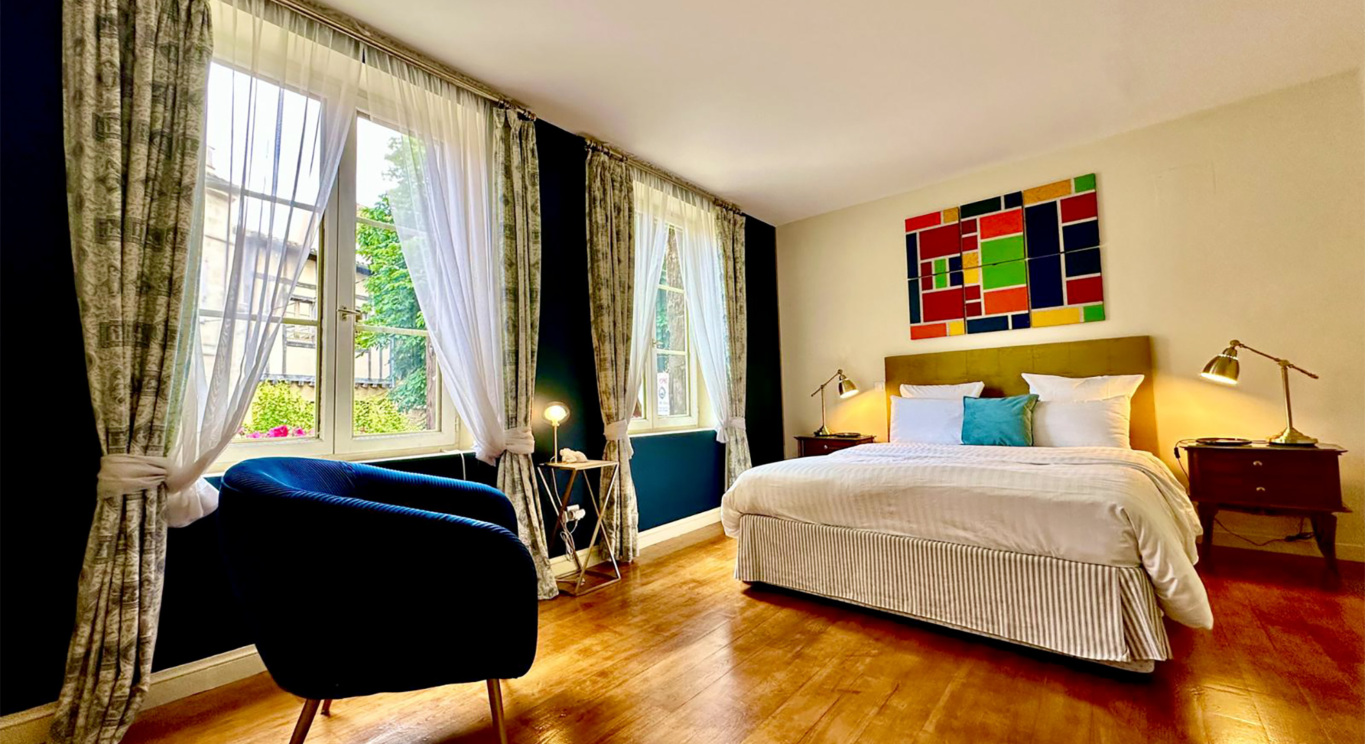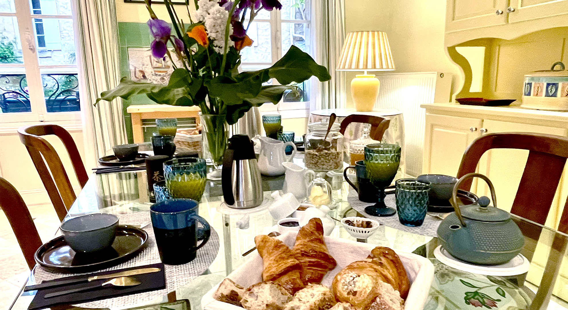 The décor combines modern and classic styles for a cozy atmosphere. A selection of dishes and cutlery is available for breakfast service. The rooms have been refreshed with splashes of color on the walls.