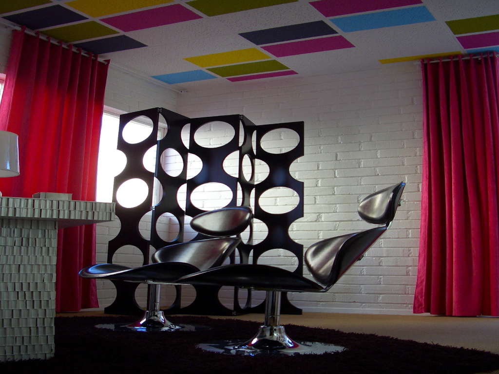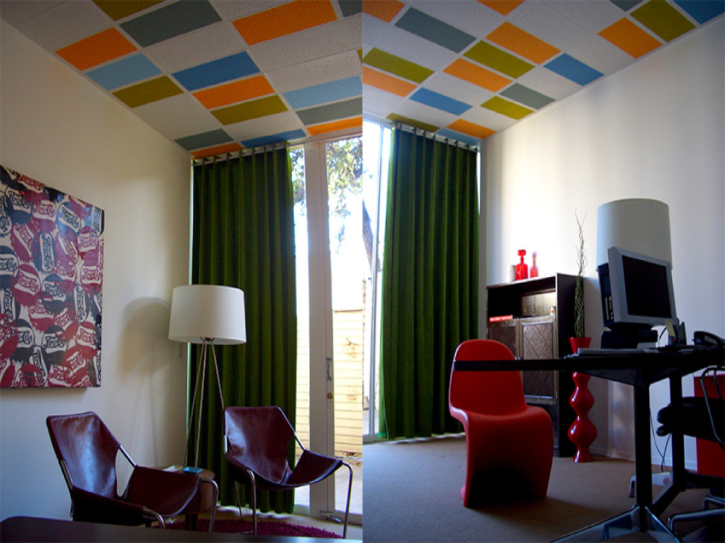Décoration et aménagement de 3 espaces bureaux et récèption, pour une agence de talents à Los Angeles sur wilshire Bld. Les clients souhaitaient dynamiser les espaces de bureaux avec originaltée et couleurs, pour accompagner un mobilier ultra design. J'ai donc decidé de donner de la vie au plafond en peignant judicieusement certains carrés en couleur.